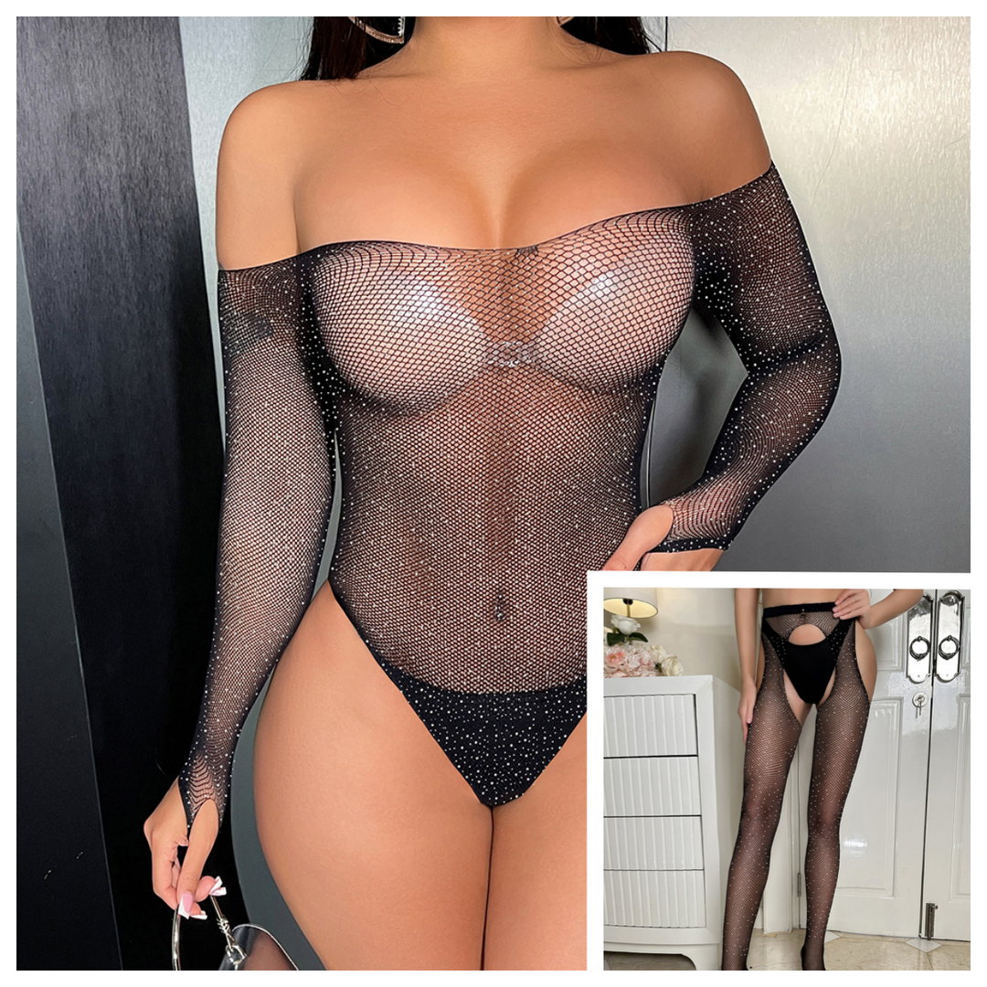 Sparkling Rhinestone Fishnet Bodysuit & Garter Stockings Set