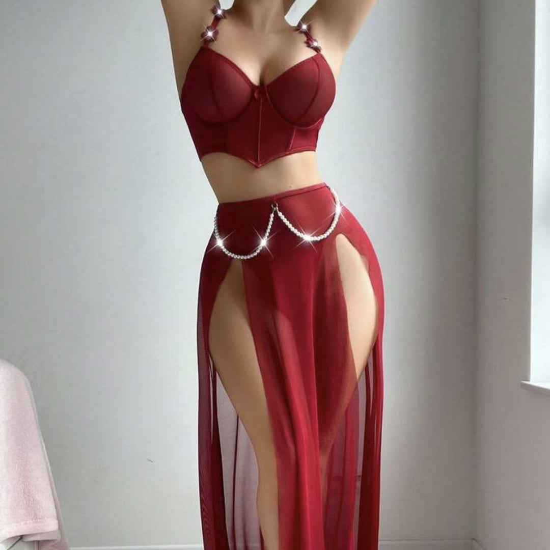Pearl String Open-Crotch Thong & Sheer Slit Skirt Set